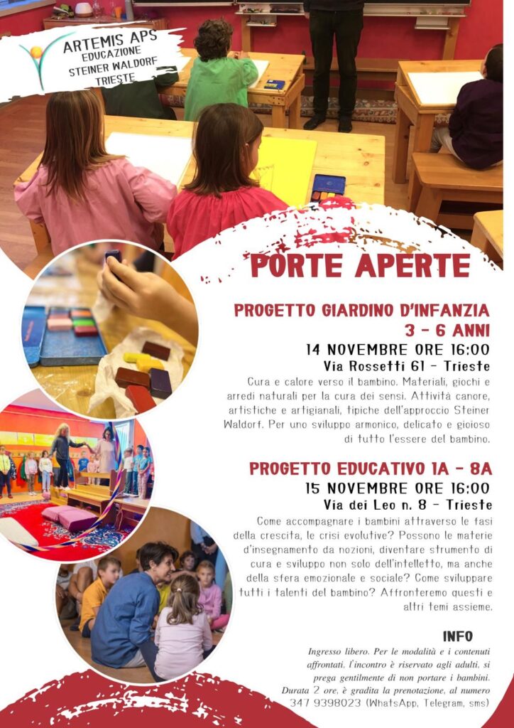 Una bella occasione per conoscere le nostre attivitร educative rivolte a tutte le etร . Due pomeriggi per conoscere gli aspetti salienti della pedagogia e dei programmi didattici Steiner-Waldorf. Parleremo di come accompagniamo i bambini dai 3 fino ai 14 anni, rispettando i tempi dellโinfanzia e sostenendo ogni fase della crescita, anche nelle sue crisi evolutive. Dallโatmosfera calda e accogliente del giardino dโinfanzia, dove materiali naturali, giochi semplici, canti e attivitร manuali nutrono i sensi e la fantasia, fino al percorso che dalla prima allโottava guida i ragazzi in un cammino che coinvolge mente, cuore e volontร . Le materie scolastiche diventano strumento di sviluppo interiore, coltivando intelligenza, creativitร , capacitร sociali e senso di sรฉ. Ti aspettiamo per raccontarti il nostro approccio e rispondere a ogni tua domanda.